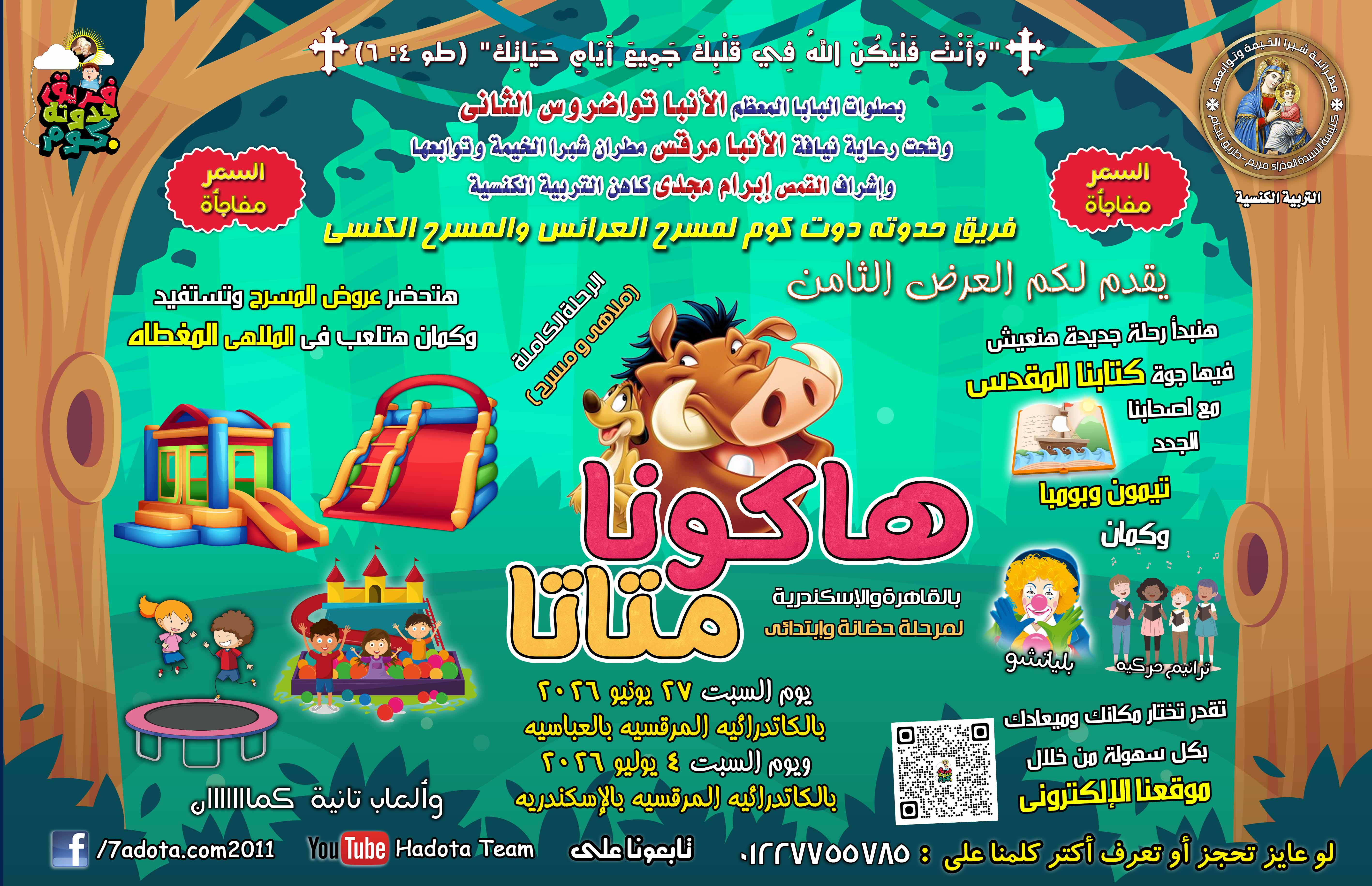 قدم فريق حدوتة دوت كوم العرض الثامن 🤗 و الرابع بالإسكندرية والكرنفال الرابع عشر بعنوان ( هاكونا متاتا 1 )🦁 بالقاهرة والإسكندرية حضر الأطفال يوم روحى وترفيهى عن مفهوم الكتاب المقدس عن الثقة و الإيمان بقوة الله فى حياتنا بالقاهرة : يوم السبت 28 يونيو 2025 بالكاتدرائية المرقسة بالعباسية ⛪ واليوم كان يحتوي علي * الجزء الأول من مسرحية هاكونا متاتا عن قصة طوبيا و الملاك * فقرة الكلاون * الترانيم الحركية * مدينة ملاهى مكونة من 5 ألعاب نفخ + ورشة عمل بالصلصال بقاعة الانبا أثناسيوس بالقاهرة🛝⚽️ حضر الكرنفال أكثر من 1100 طفل من المراحل المختلفة من 15 كنيسة من القاهرة و السويس 😍 كنيسة السيدة العذراء مريم بيجام كنيسة مارجرجس بالسويس كنيسة العذراء و البابا كيرلس اغاخان كنيسة العذراء مريم بالقصيرين كنيسة العذراء مريم و مارجرجس بأرض أيوب بشبرا كنيسة مارجرجس بالجيوشي بشبرا كنيسة العذراء ومارمينا بمدينة السلام - اسبيكو كنيسة السيدة العذراء القطامية حضانة البراعم الصغيرة كنيسة العذراء و ابو سيفين عزبة النخل كنيسة ماربولس العبور كنيسة السيدة العذراء مريم النزهة حضانة العذراء مريم بدرياس عين شمس كنيسة العذراء مريم ومارمرقس الحوامدية كنيسة الشهيدة دميانة بمدينة الأمل نورتونا و فرحنا جداً بوجودكم معانا 🥰 ================================= بالاسكندرية: يوم السبت 12 يوليو 2025 بالكنيسة المرقسية بالإسكندرية ⛪️ واليوم كان يحتوي علي * الجزء الأول من مسرحية هاكونا متاتا عن قصة طوبيا و الملاك * فقرة الكلاون * الترانيم الحركية حضر الكرنفال أكثر من 1000 طفل من المراحل المختلفة من 15 كنيسة بالإسكندرية 😍 الكاتدرائيه المرقسيه بالإسكندرية كنيسة مارجرجس بسبورتنج كنيسة الشهيد مارمينا بالمندرة السيده العذراء و البابا كيرلس عمود الدين - كليوباترا كنيسة الأنبا تكلا - الإبراهيمية كنيسة الشهيدة دميانة بالحضرة كنيسة السيدة العذراء وماربولس بكرموز كنيسة السيدة العذراء مريم بمحرم بك كنيسة السيدة العذراء مريم - سيدى بشر كنيسة الشهيد مارمينا - فلمنج كنيسة القديسين اباكير و يوحنا بابي قير كنيسة السيدة العذراء مريم - غيط العنب كنيسة الأمراء مكسيموس و دوماديوس بالعصافرة كنيسة البابا أثناسيوس بالسيوف كنيسة العذراء وبولس الرسول بالحضرة الجديدة نورتونا و فرحنا جداً بوجودكم معانا 🥰 ==================================== خدم فى اليوم بكل حب وفرح أكثر من 160 خادم و خادمة من فريق حدوتة في عرض القاهرة و اكتر من 60 خادم و خادمه في عرض اسكندرية 💪 ما بين الفقرات المختلفة و التنظيم والخدمات الأخرى❤
