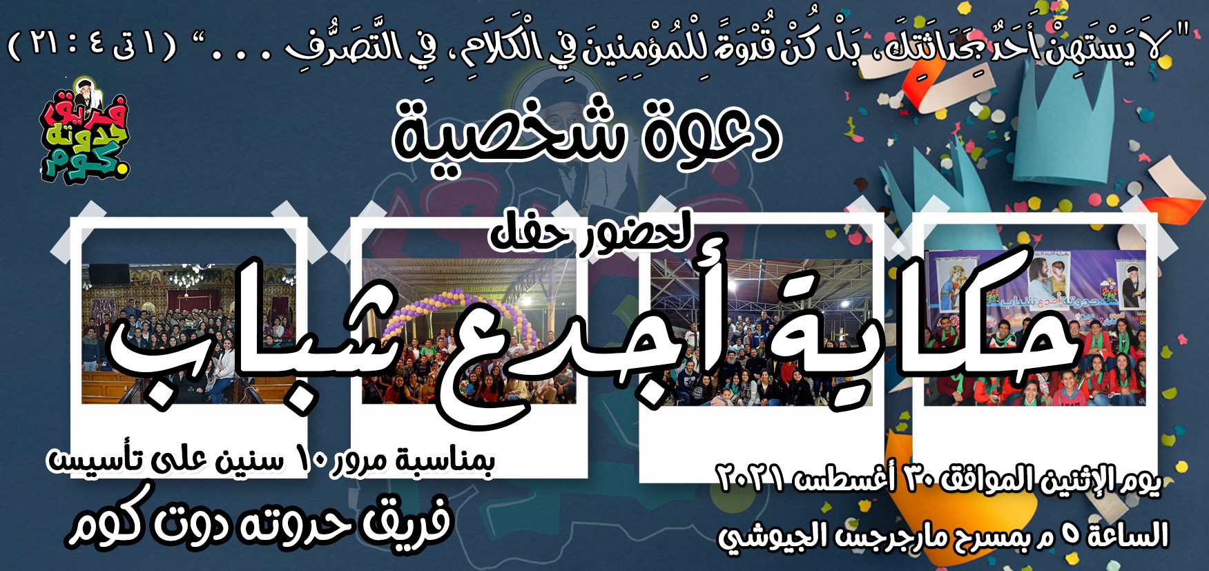 قدم فريق حدوتة حفله بعنوان (حكاية أجدع شباب) بمناسبة مرور 10 سنوات على تأسيس الفريق يوم الإثنين 30 أغسطس 2021 على مسرح كنيسة مارجرجس الجيوشي بشبرا و كان من المفترض تقديمها فى شهر مارس (شهر ميلاد الفريق) ولكن تم تأجيلها لظروف الغلق و الكورونا فى ذلك الوقت ... قدم الفريق عرضين مميزين (غرفة الحواديت ) تحكى كيف يخدم شباب فريق حدوتة عن طريق قصة خيالية أبطالها ماسكات العروض وهم يعيشون حياتهم اليومية داخل غرفة حدوتة فى كنيسة السيدة العذراء مريم بيجام ويقودهم شفيع الفريق القديس أبونا يسطس الأنطونى - و العرض الثانى (شموع مارس ) وكانت عرض متميز ونقلة كبيرة للفريق فى عالم المكياج المسرحى حيث قدم الفريق فيه 5 شخصيات من قديسين شهر مارس ( البابا كيرلس السادس - البابا شنودة الثالث - القمص بيشوى كامل - القمص ميخائيل إبراهيم - أبونا فلتاؤس السريانى) و كان يوم مفرح ومميز جداً للفريق ومشرف يليق بالاحتفال بمرور 10 سنوات على التأسيس