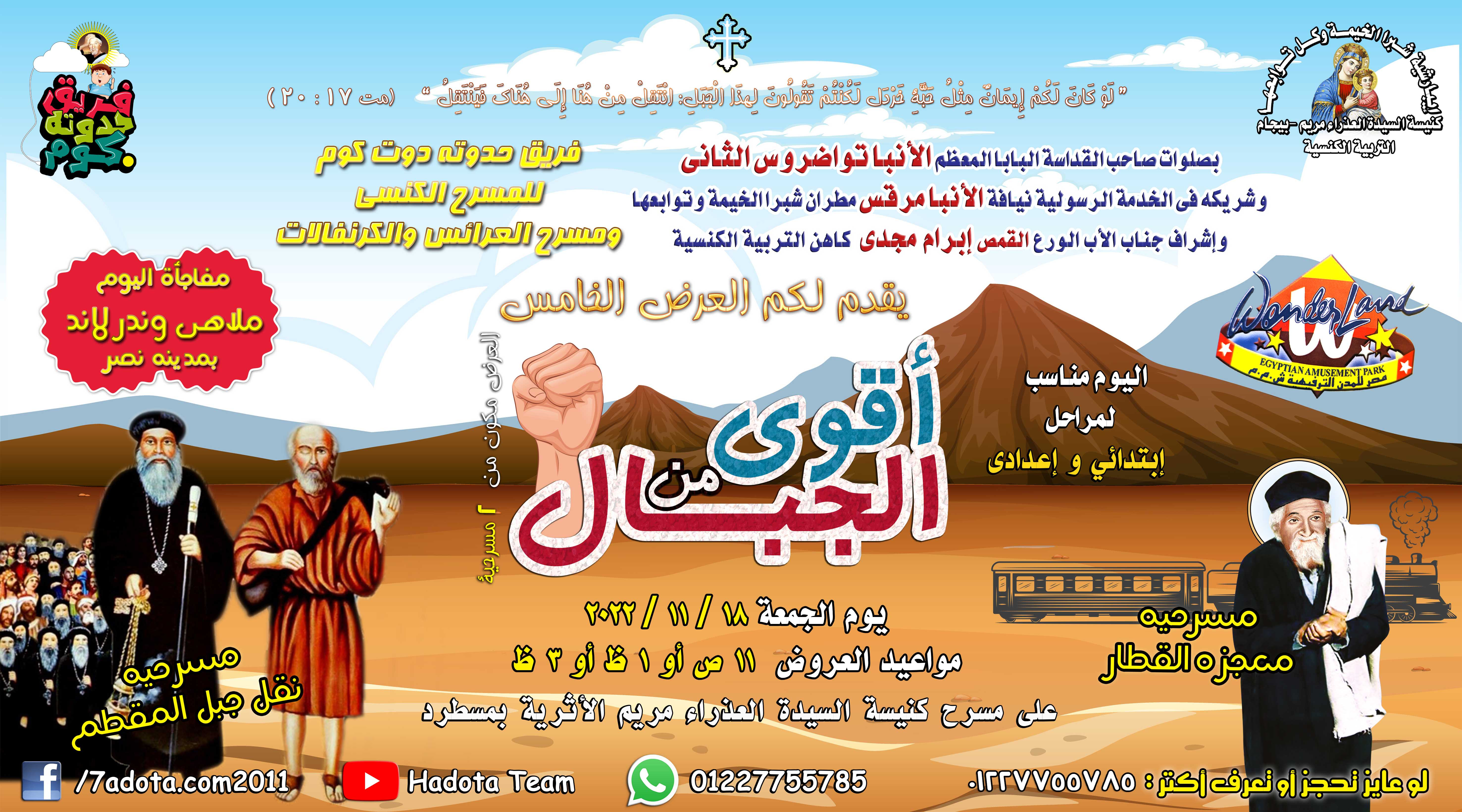 قدم الفريق العرض الخامس بعنوان أقوى من الجبال على مسرح كنيسة السيدة العذراء مريم بمسطرد عن هدف الإيمان و الثقة بوعود الله عن طريق تقديم قصة نقل جبل المقطم بشكل درامى ممتاز و قصة معجزة القطار لشفيعنا القديس أبونا يسطس الأنطونى بجانب ملاهى وندر لاند بالتنسيق الكامل مع الفريق فى نفس اليوم يوم السبت الموافق 18 نوفمبر 2022 و خدم فى اليوم أكتر من 50 خادم وخادمة وحضر اليوم أكثر من 400 طفل من كنائس مختلفة كنيسة العدرا الزيتون و كنيسة الملاك و الرومانى بالمطرية و كنيسة مارجرجس بالقللى وأسر وعائلات من كنائس مختلفة