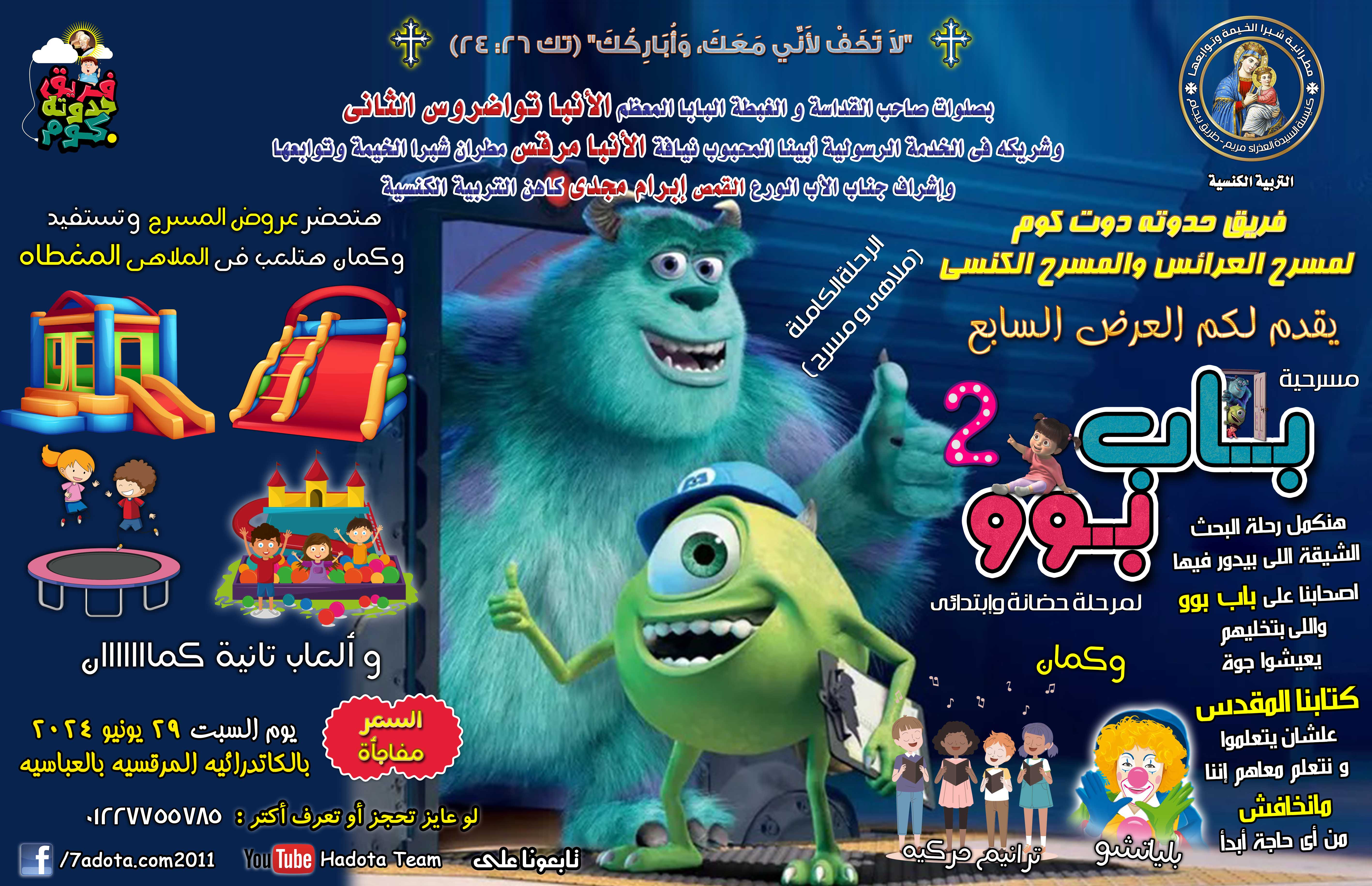 قدم الفريق العرض السابع و الكرنفال الثانى عشر وهو عبارة عن الجزء الثانى من باب بوو على مسرح الانبا رويس بالكاتدرائية المرقسية بالعباسية عن هدف الشجاعة وعدم الخوف ايضا و مدينة بقاعة الأنبا اثناسيوس بالكاتدرائية يوم السبت الموافق 29 يونيو 2024 و خدم فى اليوم أكتر من 90 خادم وخادمة وحضر اليوم فى حدود 950 طفل من كنائس مختلفة كنيسة السيدة العذراء القصيرين و كنيسة مارجرجس هليوبوليس و كنيسة العدرا و البابا كيرلس بأغاخان كنيسة الأميرين تادرس بجاردينيا وكنيسة السيد العذراء روض الفرج و كنيسة مارجرجس شبرا البلد و كنيسة العذراء مريم ومارمرقس الحوامدية وكنيسة مارجرجس المنيل وكنيسة العذراء بطولون وكنيسه الأنبا رويس بشبرا البلد و كنيسة مارمرقس النزهة 2 و كنيسة العدرا ومارجرجس بعبود و كنيسة العذراء مريم القطاميه و العذراء مريم ومريم المجدليه شبرا الخيمه وكنيسة العدراء ومارمينا مدينه نصر وكنيسه مارجرجس الصباح السويس وأسر وعائلات من كنائس مختلفة وقدم الفريق نفس العرض بالأسكندرية على مسرح الكنيسة المرقسية يوم السبت 6 يوليو 2024 وحضر العرض اكتر من 400 طفل من الأسكندرية من كنائس مختلفة الكنيسة المرقسية و كنيسة العذراء والبابا كيرلس كليوباترا وكنيسة مارمينا المندرة و كنيسة القديسين و كنيسة الشهيدة دميانة الحضرة و كنيسة مارجرجس سيدي بشر و كنيسة مكسيموس ودوماديوس والقوي الانبا موسي العذراء وكنيسة الانبا موسى المنشيه