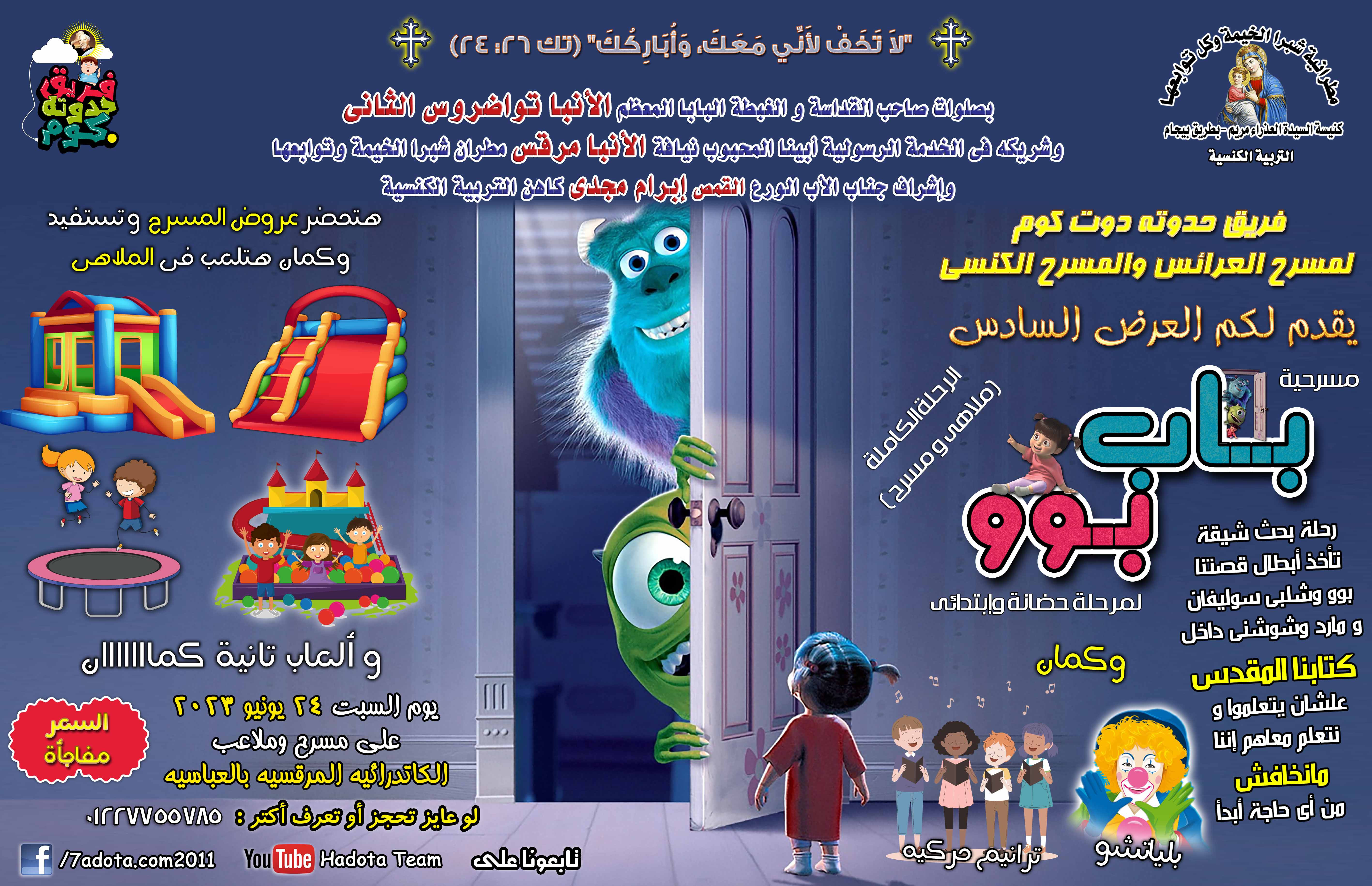 قدم الفريق العرض السادس و الكرنفال العاشر بعنوان باب بوو – الجزء الاول على مسرح الانبا رويس بالكاتدرائية المرقسية بالعباسية عن هدف الشجاعة وعدم الخوف و مدينة ملاهى بملاعب نادي الانبا رويس بالكاتدرائية يوم السبت الموافق 24 يونيو 2023 و خدم فى اليوم أكتر من 90 خادم وخادمة وحضر اليوم أكثر من 950 طفل من كنائس مختلفة كنيسة العدرا الزيتون وكنيسة السيدة العذراء القصيرين و كنيسة مارجرجس هليوبوليس وكنيسة مارمينا و البابا كيرلس حدائق حلوان و كنيسة العدرا و البابا كيرلس بأغاخان كنيسة الأميرين تادرس بجاردينيا و كنيسة مارجرجس منشية التحرير وكنيسة السيد العذراء روض الفرج و كنيسة مارجرجس شبرا البلد وكنيسة جوارجيوس ابو طاقية و كنيسة مارمرقس النزهة 2 و كنيسة السيدة العذراء مريم و مارمينا مدينة نصر وأسر وعائلات من كنائس مختلفة وقدم الفريق نفس العرض بالأسكندرية على مسرح الكنيسة المرقسية يوم السبت 19 أغسطس 2023 وكان هذا اول خدمات الفريق بالإسكندرية لتتوالى فى العروض التالية وحضر العرض اكتر من 400 طفل من الأسكندرية من كنائس مختلفة كنيسة العذراء والبابا كيرلس كليوباترا و كنيسة العذراء مريم محرم بك وكنيسة مارمينا المندرة و كنيسة الأنبا كاراس و الارشيدياكون بطوسون وكنيسة السيدة العذراء و الشهيد سمعان الاخميمى – غربال و كنيسة القديسين و كنيسة الشهيدة دميانة الحضرة