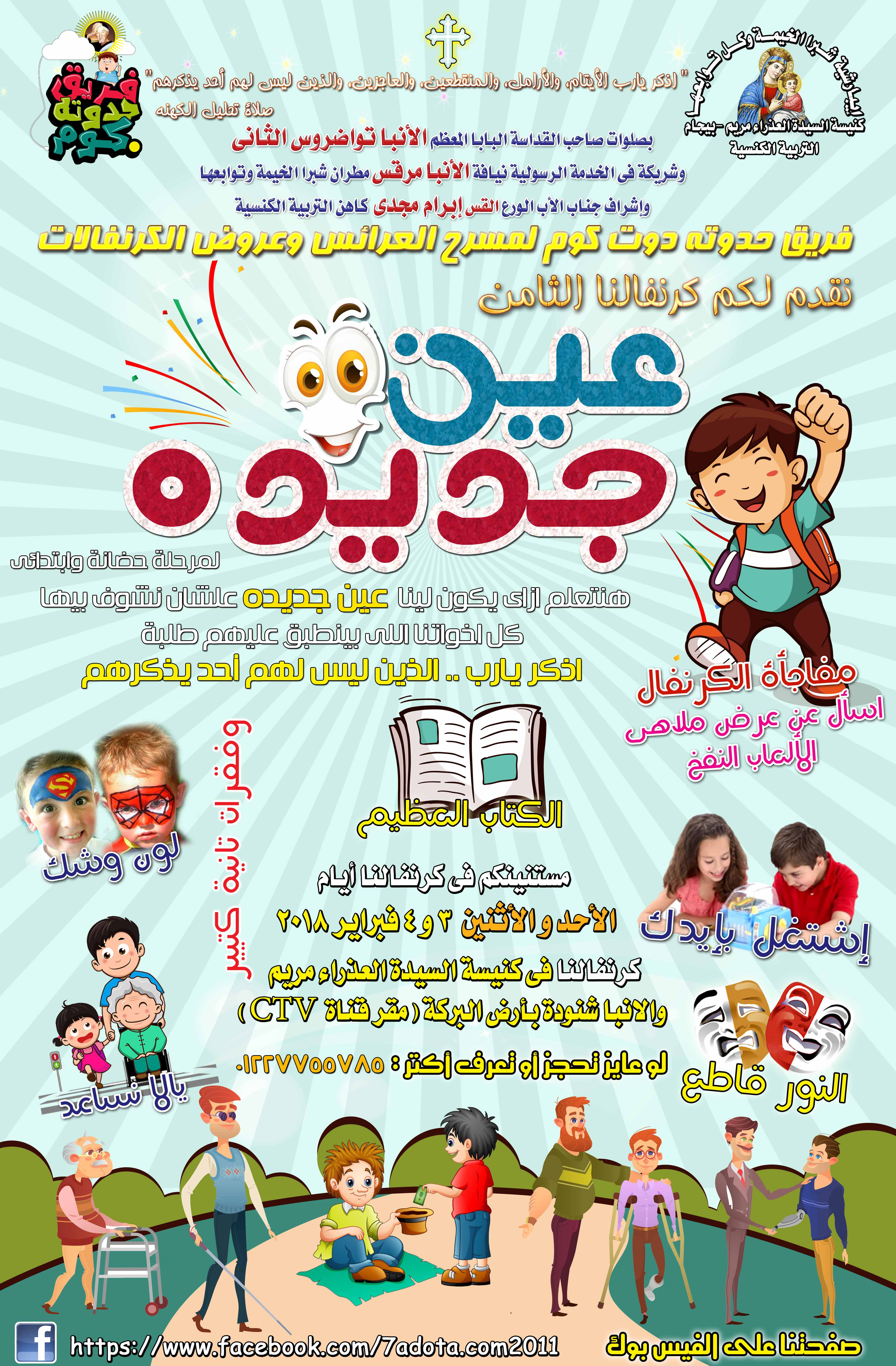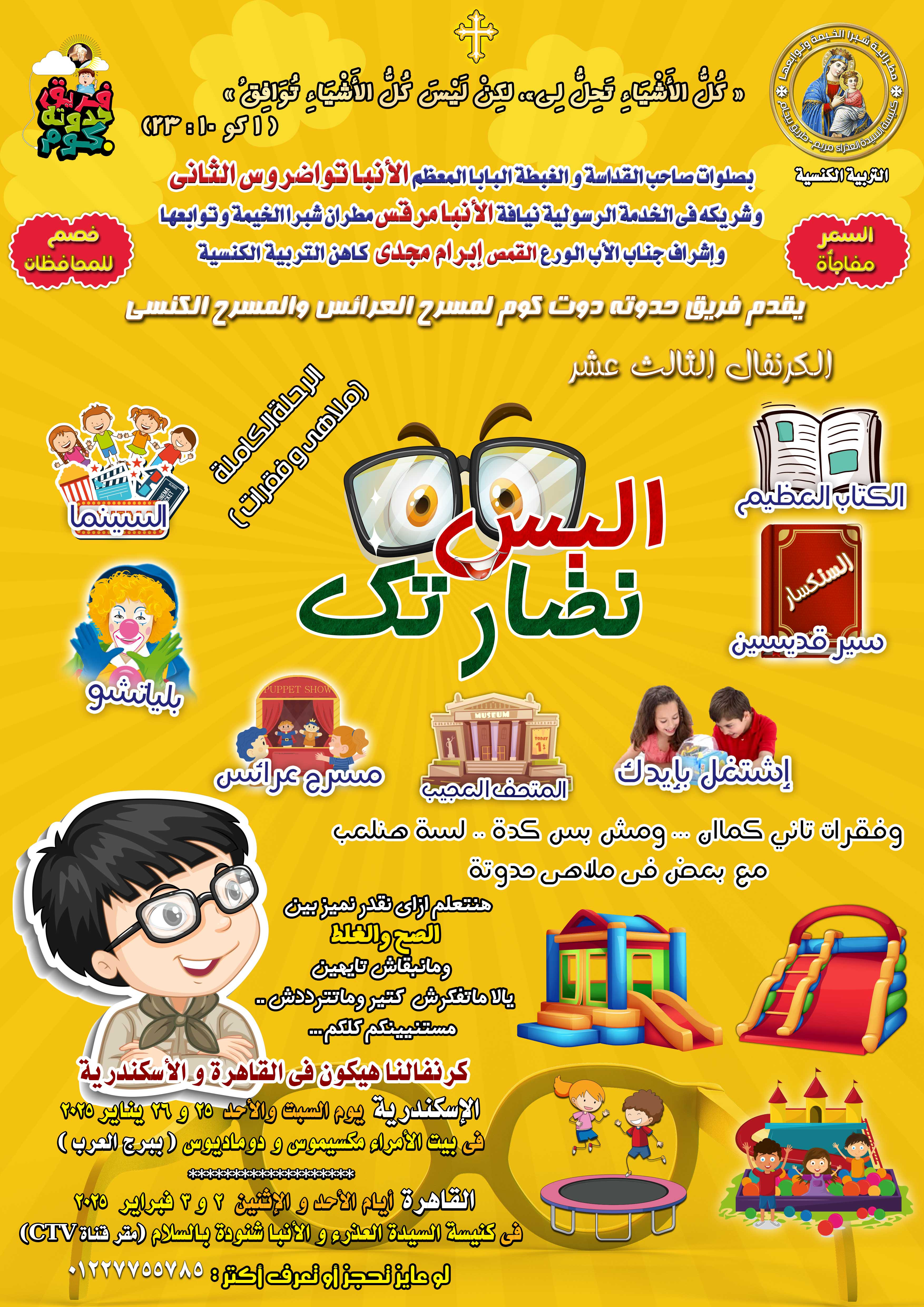 قدم الفريق بتجهيز كرنفاله الثالث عشر بعنوان البس نضارتك عن هدف كيفية التمييز بين الصح و الخطأ بالقاهرة بكنيسة السيدة العذراء و الأنبا شنودة بمدينة السلام أيام الأحد والإثنين 2 و 3 فبراير 2025 و فى الإسكندرية يوم السبت 25 يناير ببيت الأمراء مكسيموس ودوماديوس ببرج العرب